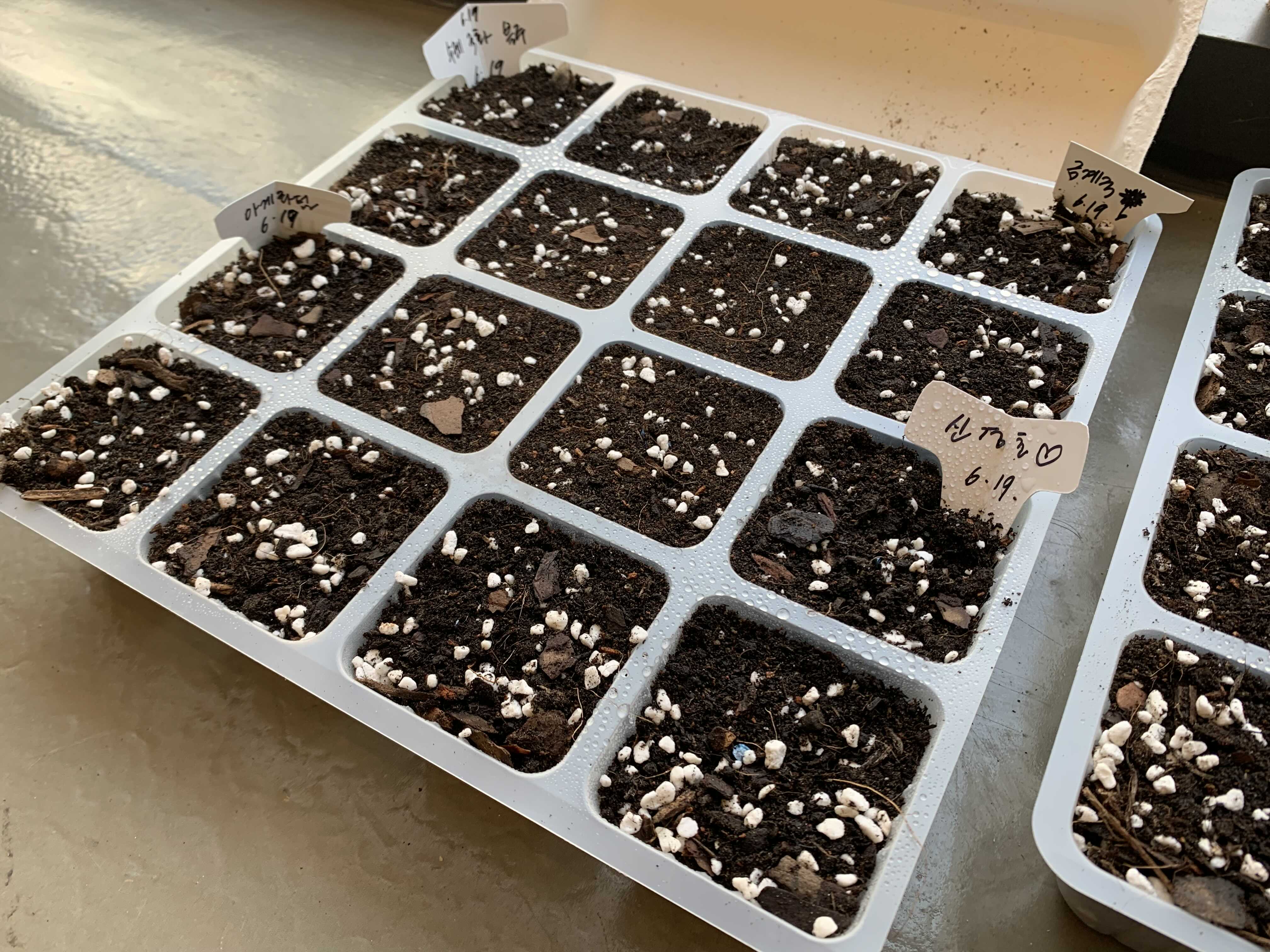 마침 친구가 놀러왔는데 모종화분과 씨앗이 딱 도착했지 ㅔ뭐예요. 깔망을 잘라 깔고 함께 흙을 덮었습니다.