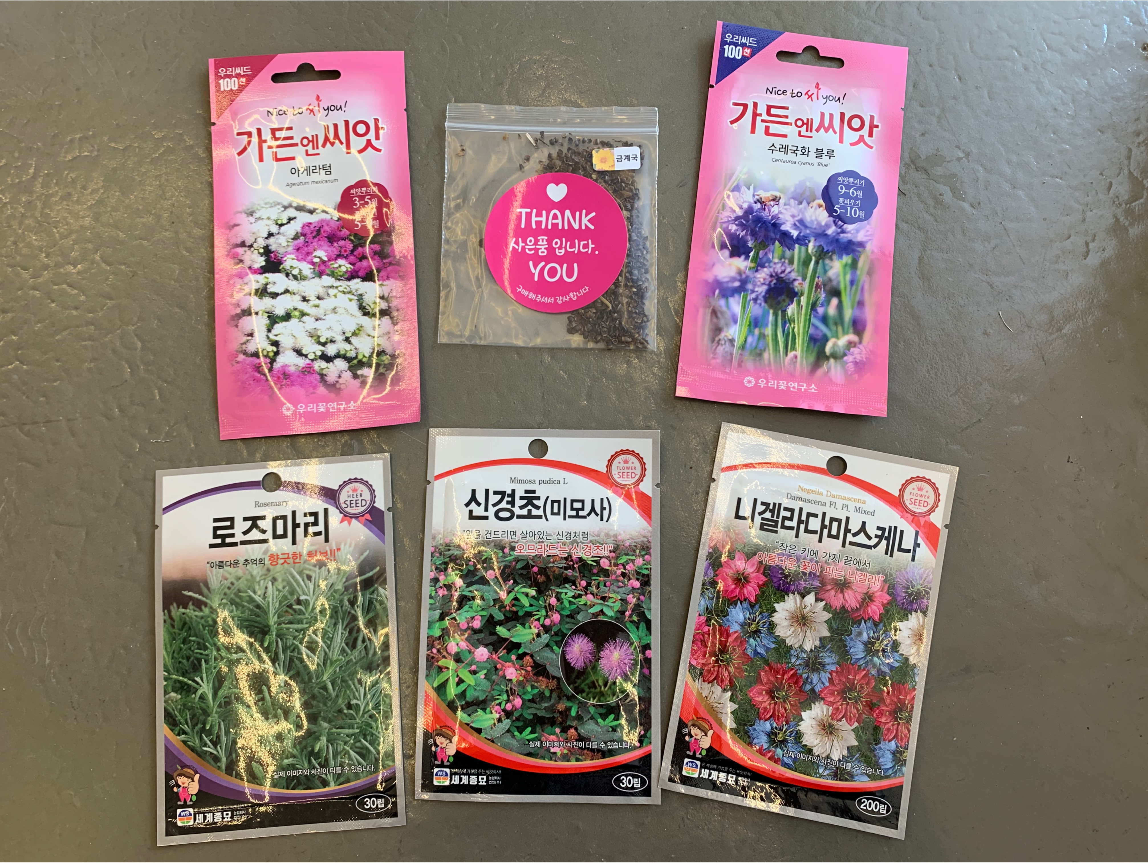 아게라텀, 금계국, 수레국화 블루, 로즈마리, 신경초(미모사), 니겔라다마스케나 씨앗입니다.