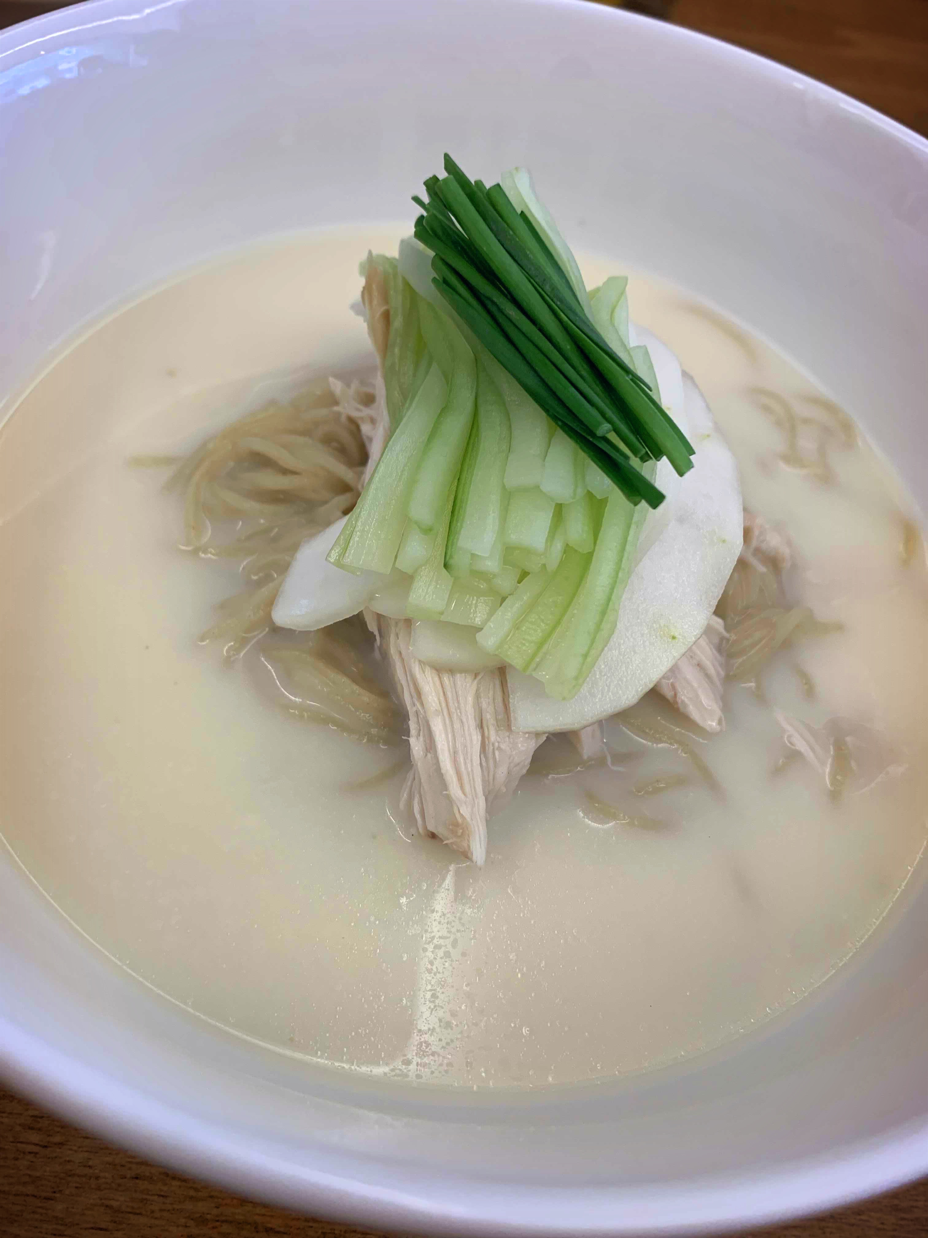 너무 차갑지 않고 적당히 시원한 콩국물에 닭육수가 고소하게 들어가있습니다. 고명으로 올라간 오이와 부추, 참외가 전부 적당히 짭짤하고 향긋해서 미숫가루를 넣어 반죽한 국수 면과 궁합을 맞춥니다. 닭고기에는 뼈가 하나도 없습니다. 콩국물에서는 삼과 대추향이 은은히 풍깁니다. 그런데 국물 자체에 거슬리는 건더기가 없습니다. 쭉 들이키고 보면 그릇에 아무것도 남지 않았습니다.