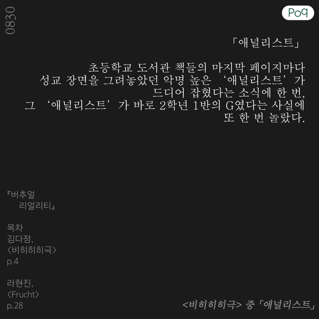 0830 월 / 『버추얼 리얼리티 Virtual Reality』 중 「애널리스트」, 김다정&라현진, (null), 2021 / 긴개 본문