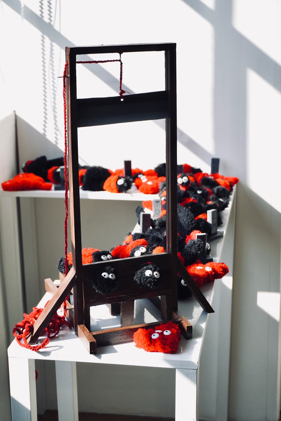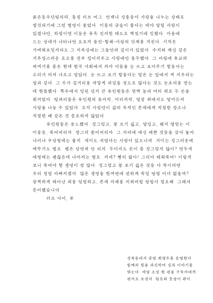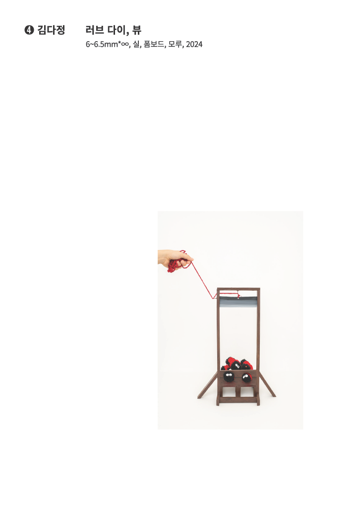 최근 한국 곳곳에 러브버그로 불리는 붉은등우단털파리가 대발생하자 시민들은 각 지자체에 화학적, 물리적 방제를 요청했다. 그러나 생명 한 종만을 겨냥한 방제가 불가능할 뿐더러 해당 문제 제기의 근거가 타당하지 않다는 과학적, 생태적 답변에 따라 공존의 가치와 합리적인 방안을 모색하자는 목소리가 커지고 있다. 김다정은 러브버그를 위한 단두대를 설치했다. <러브 다이, 뷰>에서는 차례를 기다리며 단두대 뒤로 줄지어 선 러브버그들과 이미 희생당한 러브버그들이 남긴 유언이 혼재하는 광경을 연출한다. 복슬복슬한 털과 커다란 눈망울로 모에화된 러브버그가 주는 친근함과 가차 없이 떨어질 순간을 기다리는 단두대의 섬뜩함이 대비되며 시각적 호오에 따라 존재의 생명권을 좌지우지하려는 잔인함과 무지함에 의의를 제기한다.