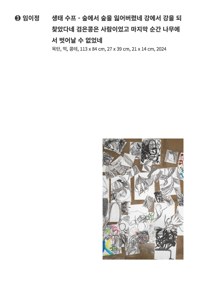 임이정은 비인간의 시선을 상상하며 포착한 자연의 혼돈과 질서, 에너지를 <생태 수프- 숲에서 숲을 잃어버렸네 강에서 강을 되찾았다네 검은콩은 사람이었고 마지막 순간 나무에서 벗어날 수 없었네>에 담았다.