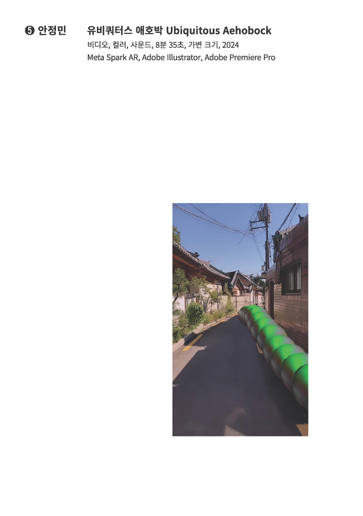 안정민은 반찬의 재료로 여기던 애호박의 본체에 주목했다. 애호박의 덩굴손이 뻗어나가는 힘과 출처 모를 의지, 생명력에 사로잡힌 그는 자신의 덩굴에게 새로운 시공간에서의 성장 가능성을 선물한다. 그가 제작한 <유비쿼터스 애호박>은 인스타그램 AR 필터이다. 필터 씌운 카메라로 눈가를 비추면 잎이 피어나고 입에서는 애호박이 쏟아진다. 시선 닿는 곳에서부터 덩굴이 자라나도록 영상을 촬영할 수도 있다. 좁은 텃밭에 뿌리내리고 넓은 도로에 앞길을 가로막힌 덩굴이 가상세계에서 널리 퍼져나가고, 어디서든 원하는 곳에 열매를 맺을 수 있길 바라는 마음은 애호박에게 새로운 아이덴티티와 가능성을 부여한다.