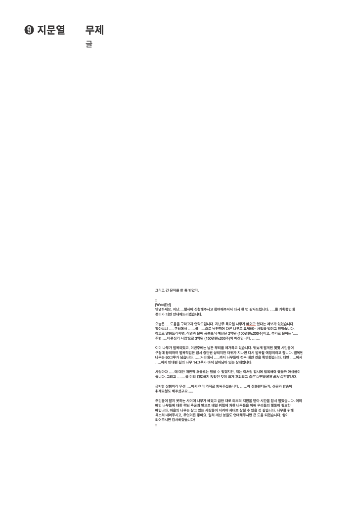 지문열은 텍스트 더미에서 자신의 이야기를 구분하고 또 녹아들었다. 언제나 한 걸음 뒤에서 관조하는 그는 자연과 자신의 거리를 좁혀나가기 위한 방법으로 텍스트를 상상하고, 텍스트를 모으고, 텍스트를 엮었다. 지문열은 사후에 나무가 되는 방법을 상상하고 또 나무의 인상을 표현하는 방법을 찾기 위해 고민한다. 나무에 깃드는 것, 나무가 베어지는 상황, 나무와 인류의 역사 등을 다룬 텍스트를 통해 그는 자신을 드러내기보다 그 고찰만을 남겨두려 한다. 그가 함께 읽고자 한 텍스트는 아래와 같다.