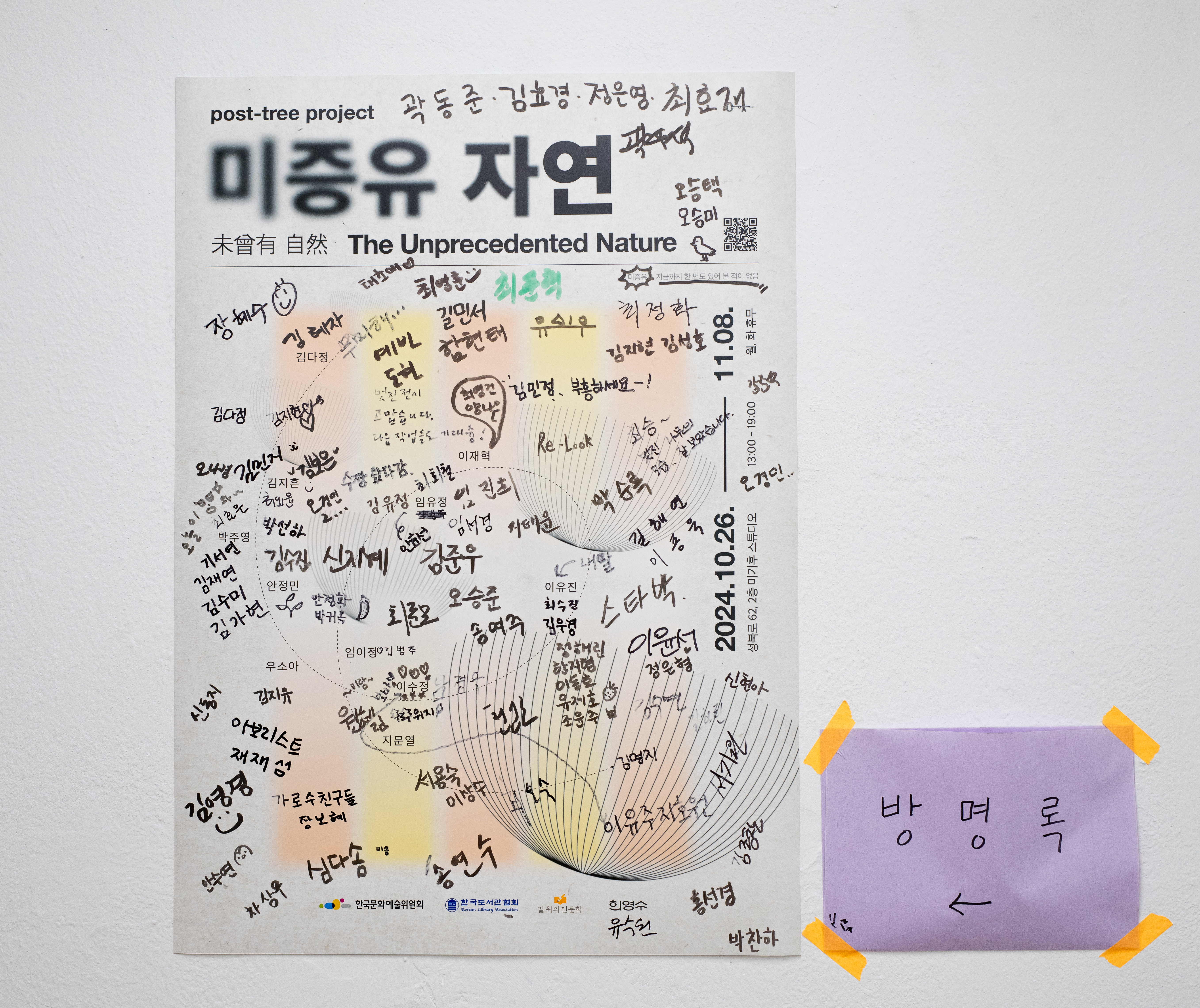 p.s. 전주시는 2000년 ‘자연형 하천 조성사업'을 도입한 이후 오염이 심각했던 전주천을 생태적으로 풍요롭고 아름다운 하천으로 돌려놓았다. 이는 각 지방단체에게 모범이 될 정도로 유례 없는 일이었다. 그러나 2022년 전주 시장이 된 우범기는 2023년 전주천과 삼천의 버드나무 260그루, 2024년 3월 남아있는 버드나무를 모조리 베어냈다. 전주생태하천협의회, 전북환경운동연합, 시민들의 반대에도 우범기의 재선 업적 쌓기는 멈추지 않았다. 한 인물의 오판이 수많은 물고기와 곤충, 새와 식물의 터전이자 시민들의 보물을 앗아간 사례를 기사로 접하고 분노했으나 원활히 표출할 방법을 찾지 못했다. 전주의 버드나무를 살리지 못한 죄책감에 좌절하기보다 이를 생산적이고 실체가 있는 형태로 되살려 손 닿는 거리의 자연에 보탬이 되고자 post-tree project를 떠올렸다. 같은 시기에 우연히 길위의인문학 지원사업을 접하고 개인 프로젝트를 단체활동으로 발전시켰다. 그 활동의 일환으로 이번 전시를 준비했다. 《미증유 자연》은 베어진 전주천 버드나무 그루터기서 자라난 꺾이지 않는 가지다.