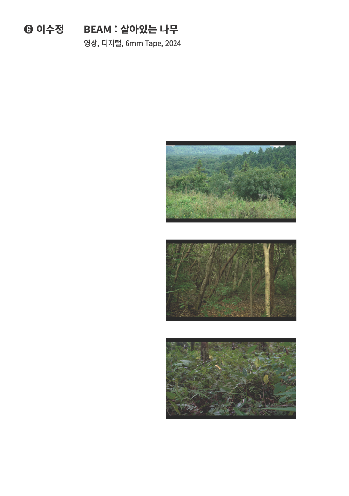 한 남자가 나무를 껴안고 그 사이를 걷는다. 잎사귀가 나부끼는 풀숲 너머에 베어지지 않은 채 생존한 나무들이 있다. 초록의 다채로운 스펙트럼이 넘실거리고 남자는 여전히 어딘가를 향하고 또 헤맨다. 이수정은 무작정 카메라를 들고 제주도로 향했다. 서귀포시 독자봉 숲, 영주산 숲, 본지오름 숲, 이승악 숲, 제주시 문도지오름 숲을 연기하는 사람 남경우와 걷고, 때로는 멈춰서 바라보았다. 인간과 자연의 사이를 좁힐 수 있는 방법에 그만의 해답을 찾기 위해 영상을 촬영하고 이를 편집했다. <BEAM: 살아있는 나무>에 등장하는 장면들은 일견 정적인듯 하지만 끊임없이 생동하고 있다. 그는 말없이 전한다. 동일한 숲을 걸어도 저마다의 감각이 수집하는 조각이 상이함을, 그러나 나누고자 하는 궁극적 순간은 때때로 일치할 수 있다는 것을.