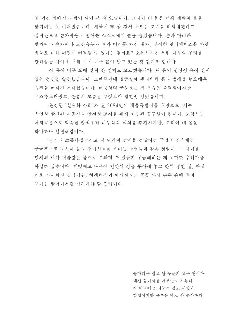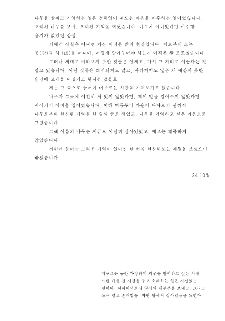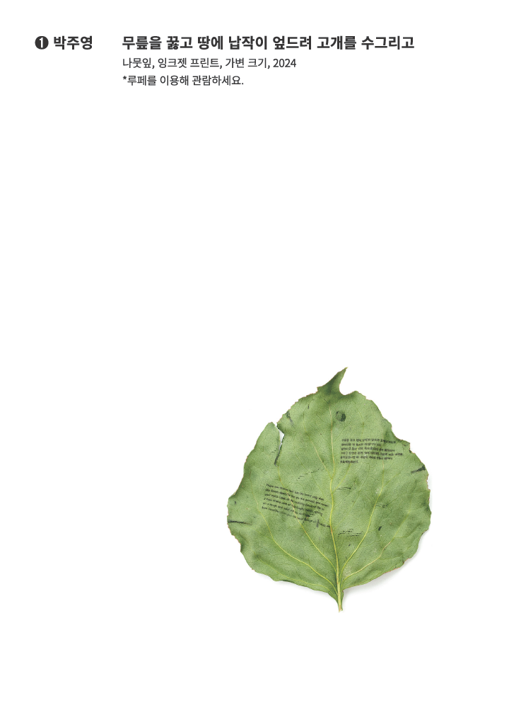 박주영은 나무와 몸을 맞춘 순간에서 피어난 생각을 이야기로 만들고 이를 나무에게 전한다. 나무의 몸으로부터 얻은 종이를 인간의 이야기를 담는 매체로 써왔던 인류가 그 반대의 상황에 처할 순 없을 지 의문을 갖는다. 들리지 않는 나무의 이야기를 상상하며 그가 자아내는 것은 이야기의 새로운 장이다. <무릎을 꿇고 땅에 납작이 엎드려 고개를 수그리고>에서 나무 하나와 인간 하나가 소통하기 위한 도구로 루페를 제안하는 박주영은 상이한 존재 사이를 연결하는 가능성으로써의 이야기를 재조명한다. 같아질 수 없고, 그럴 필요도 없는 고유한 존재들이 가장 먼저 나누어야 할 것은, 이야기이다.