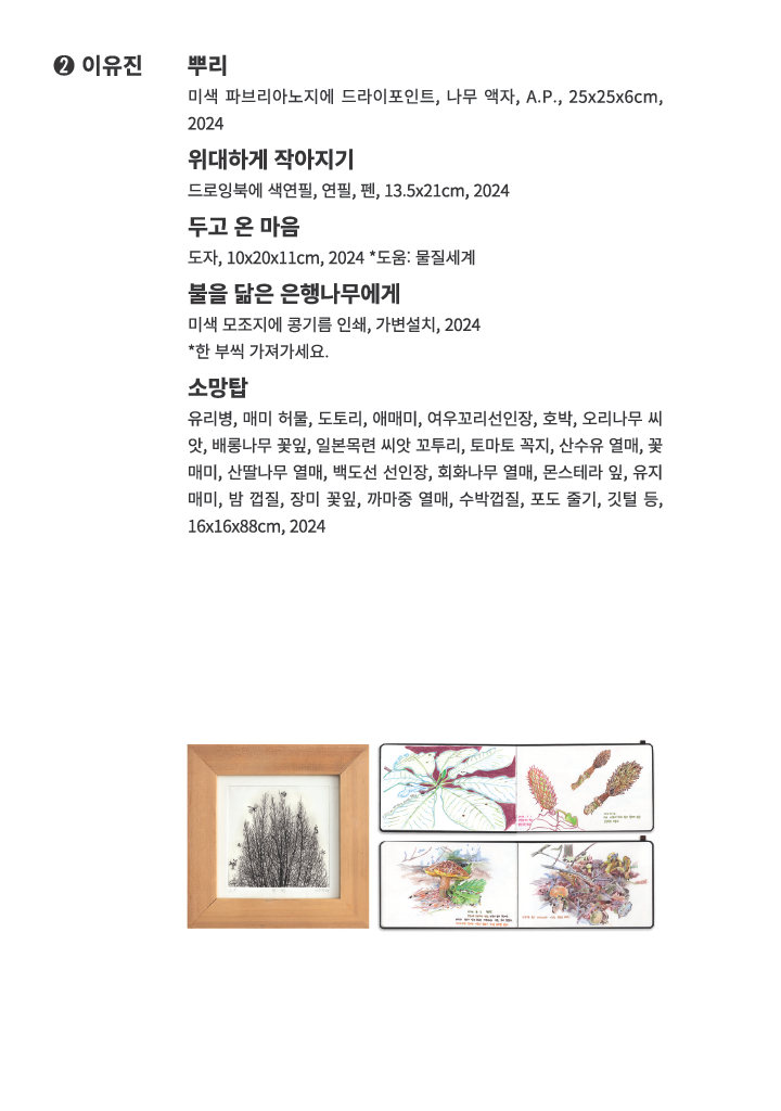 이유진은 관찰의 여정을 드로잉과 오브제로 번역했다. <위대하게 작아지기>에서는 프로젝트 기간 내내 이어진 노동에 가까울 정도로 성실하고 꾸준한 관찰을 색과 선을 갖춘 형태로 수집해 여러 겹을 쌓았다. <뿌리>는 그가 애착을 갖던 은행나무를 통해 자연과의 연결 가능성을 넓혀가려는 메시지를 품고 있다. <두고 온 마음>에는 언젠가 마주한 비둘기의 눈빛의 무게가 담겨 있다. 비둘기가 앉은 신문 더미는 <불을 닮은 은행나무에게>이다. 관객은 비둘기를 들어 올려 신문을 한 편씩 가져갈 수 있다. 비둘기의 무게를 가늠하며 신문을 펼치면 이유진이 은행나무로부터 얻은 생태 감각이 콜라주로 구현된 것을 살펴볼 수 있다. <소망탑>에 쌓아올려진 채집물들에는 그의 일부로서 흡수되고자 하는 갈망, 그로부터 새로운 층위의 생태적 에너지를 얻길 바라는 갈망 등이 혼재되어 있다.