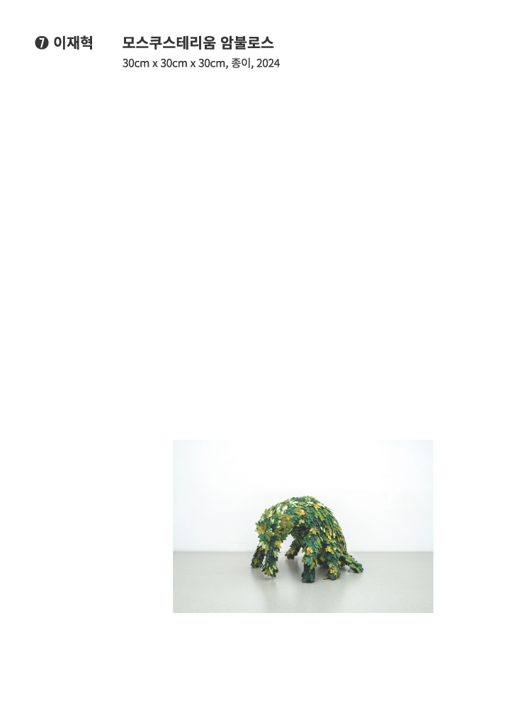 정원사가 예술혼을 다해 깎은 관목 같기도 하고 너무 느리게 걷는 탓에 몸에 이끼가 생겼다는 나무늘보 같기도 하다. 이재혁의 <모스쿠스테리움 암불로스>는 식물과 동물의 유사성에 착안해 생성된 새로운 존재이다. 전에 없던 형태와 습성을 갖고 세상에 나타난 이끼동물은 이분법적 분류에 익숙한 우리에게 당혹감과 경계심을 준다. 이끼동물이 무엇을 섭취하고 무엇을 내보내는지, 혹은 무엇을 좋아하고 무엇을 꺼리는지 상상하는 동안 우리는 낯선 존재와 거리를 좁히기 위한 새로운 방식을 궁리하게 된다. 이는 이미 익숙하다고 착각해 쉽게 관계의 선을 넘게 되는 일상적 존재와는 주고 받지 않던 관계맺음이다. 이끼동물의 등장은 종 간 소통과 거리두기 등의 시작점을 재설정하는 계기가 된다.
