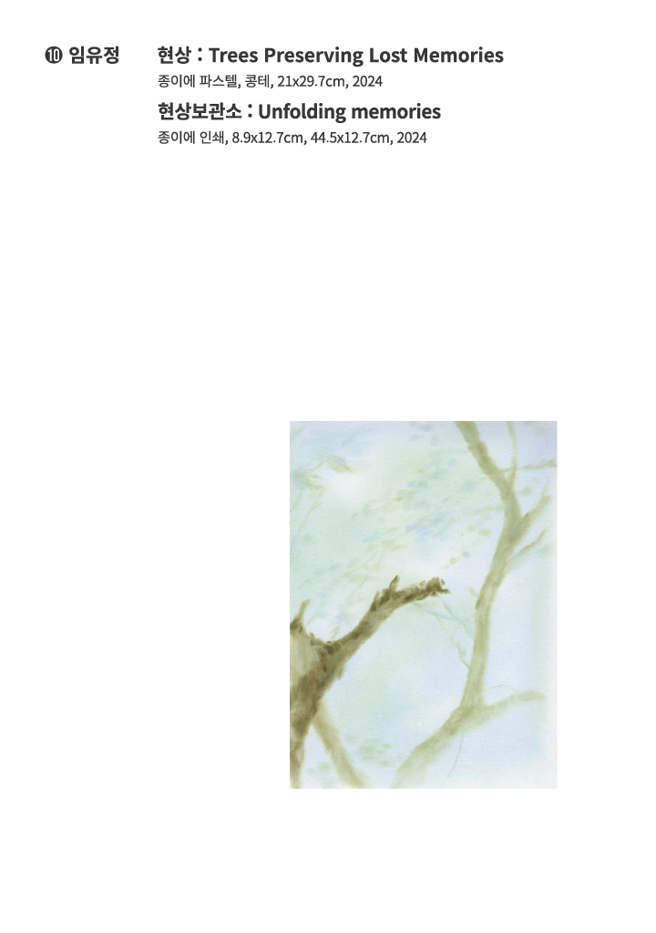 임유정은 나무가 연상시키는 기억을 마주했다. <현상: Trees Preserving Lost Memories>에서 그는 상실에 머무르기를 시도한다. 나무는 이 과정의 협력자로서 임유정 자신의 마음 들여다보기를 격려하고 기다려주고 또 들어주는 역할을 수행한다. 이는 인류의 오랜 숭배 대상이자 애니미즘적 공동체 의례의 주요한 주체였던 나무의 역할을 현대 사회의 개인이 다시금 되살려낸 것이자 잊고 있던 나무와의 관계맺기를 지속하고자 하는 새로운 의지이기도 하다. 한 나무가 살아있는 동안 적어도 한 인간이 그에게 머물기를 원한다면, 반대로 한 인간도 한 나무의 보호자가 될 수 있을 것이다.