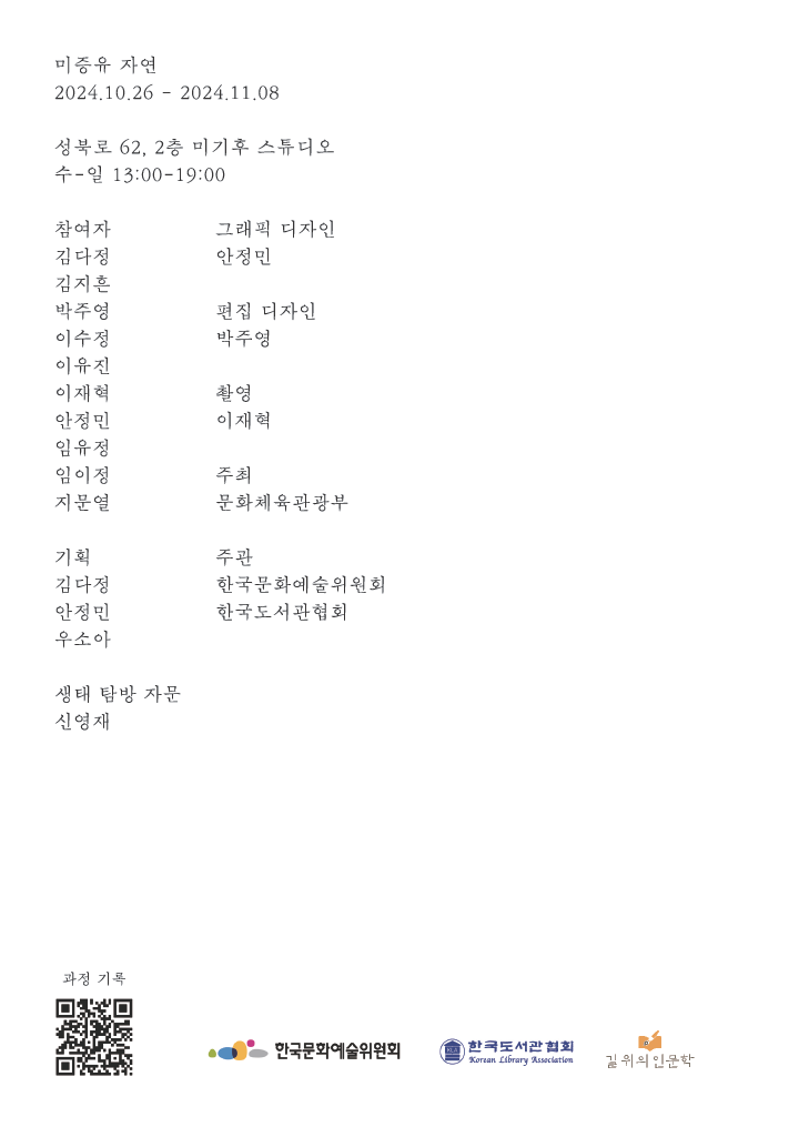 《미증유 자연 The Unprecedented Nature》은 이제껏 있어 본 적 없는, 그래서 도래하길 바라는 마음을 담은 애니미즘적 의례이자 생태예술 전시이다. 참여 작가는 전문 작가와 비전공자, 아마추어 등으로 학문적 배경과 예술에 대한 이해도가 다양하다. 또한 환경, 생태라는 주제에 관심 없던 멤버들이 여럿이라는 점에서 개인적 관심사 역시 천차만별이었다. 그럼에도 이번 전시 《미증유 자연 The Unprecedented Nature》의 핵심 장르를 생태예술로 분류할 수 있었던 것은 김융희2가 생태 예술의 지향점으로 지목했던 ‘인류를 포함한 지구 생명체의 지속가능성과 자기실현'에 대해 공통의 의견을 공유했기 때문이다. 이미 기후위기와 생태다양성이 수많은 갤러리 안에서 적극적으로 논의되고 있다. 일견 아마추어적으로 보일 수 있는 이번 작업들이 북적이는 생태예술의 장에서 소임을 할 수 있다면 그것은 바로 확장가능성과 실천적 태도일 것이다. 전시를 준비하는 반년간 멤버들은 정기 모임 시간 외에도 생태를 탐방하고 관찰하고 기록하며 외부 워크숍에 참여하기도 했다. 전시를 위해 작업을 한 시간보다 자연과 친해지기 위해 보낸 시간이 더 길 것이다. 자연과 관계맺기라는 목적과 관찰, 연구, 창작이라는 수단을 구분해 이해하고 생태윤리적 태도를 지향하되, 엄격하고 까다롭기보다는 유머를 겸비한 지속가능한 자세를 취하려 했다. 또한 이번 전시가 일회성 생태쇼가 되지 않도록 전시의 관람객과 적극적으로 소통하고 이를 다시 나누며 생태예술의 폭을 넓히고자 한다.